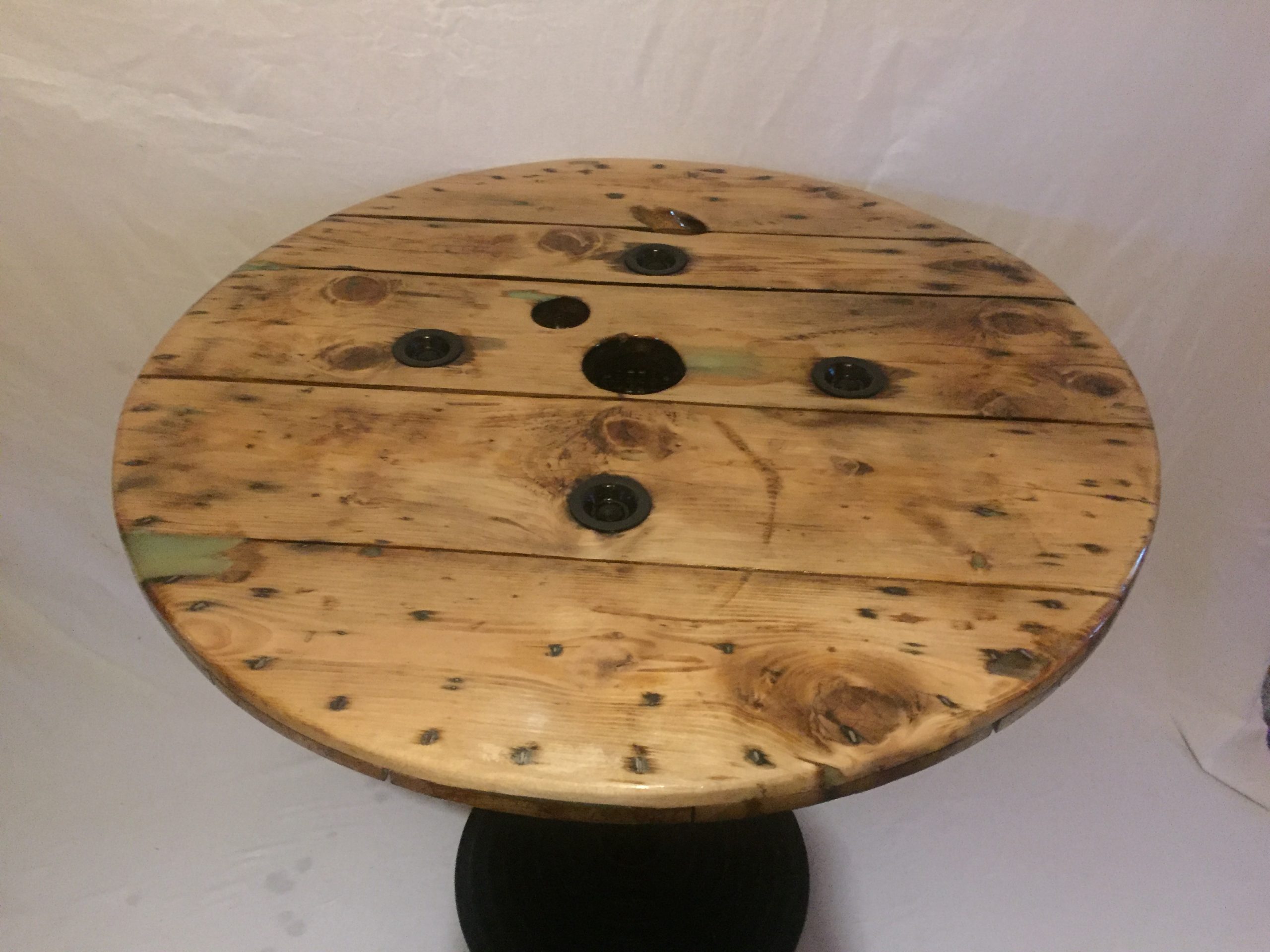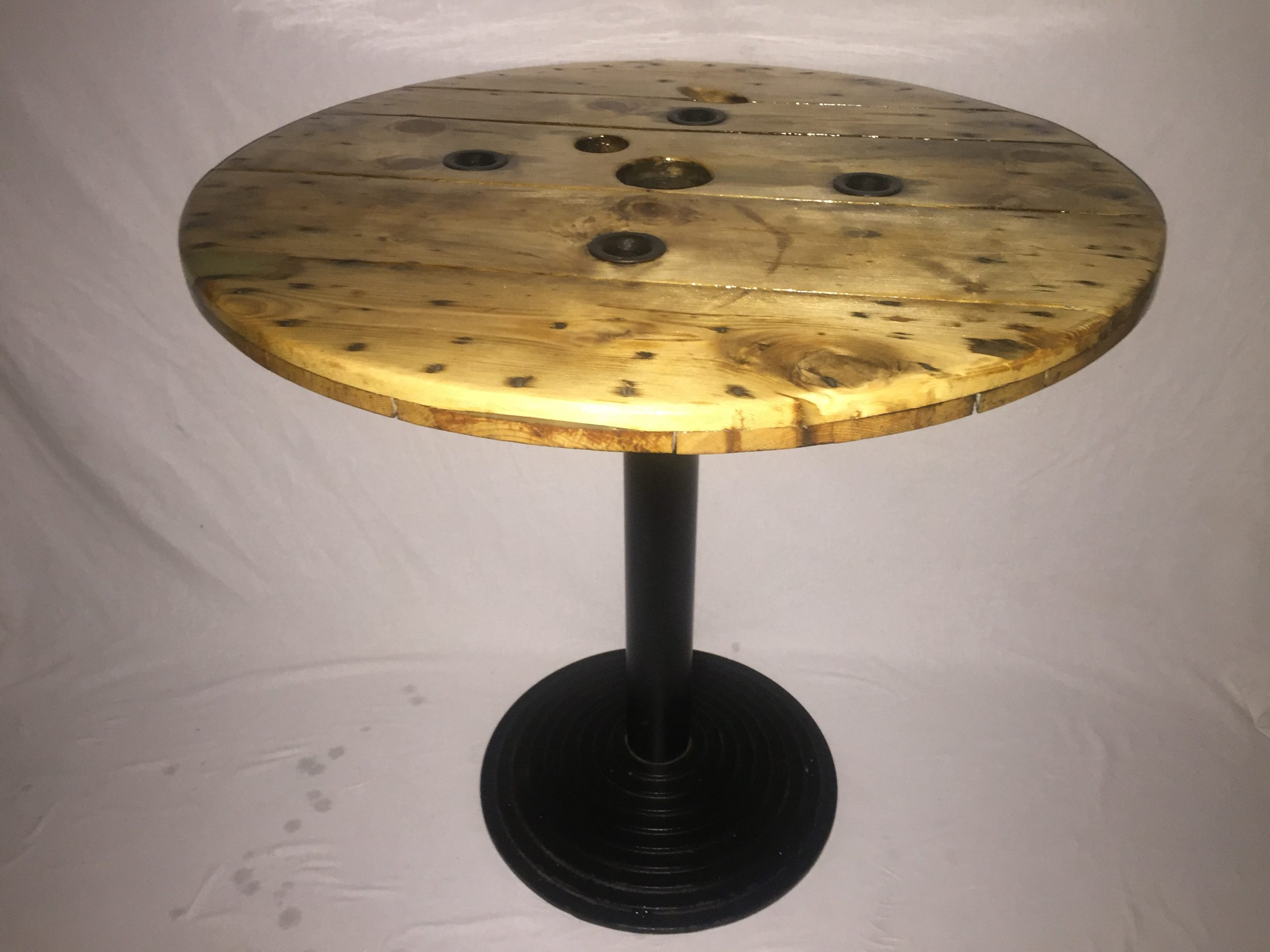 Retro/ Industrial style Unique Cable reel table with cast iron table base.