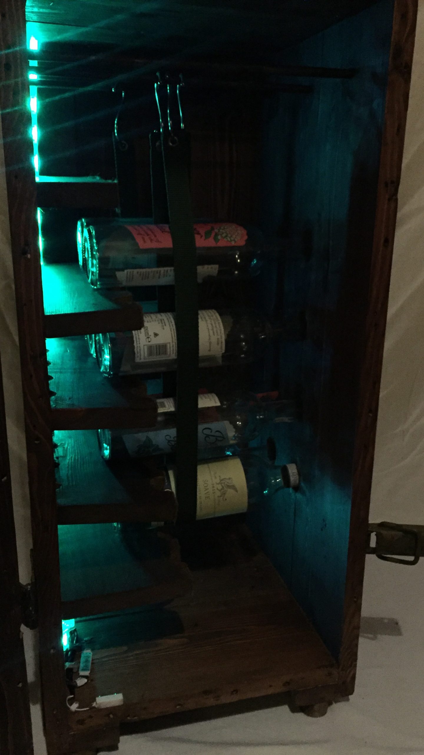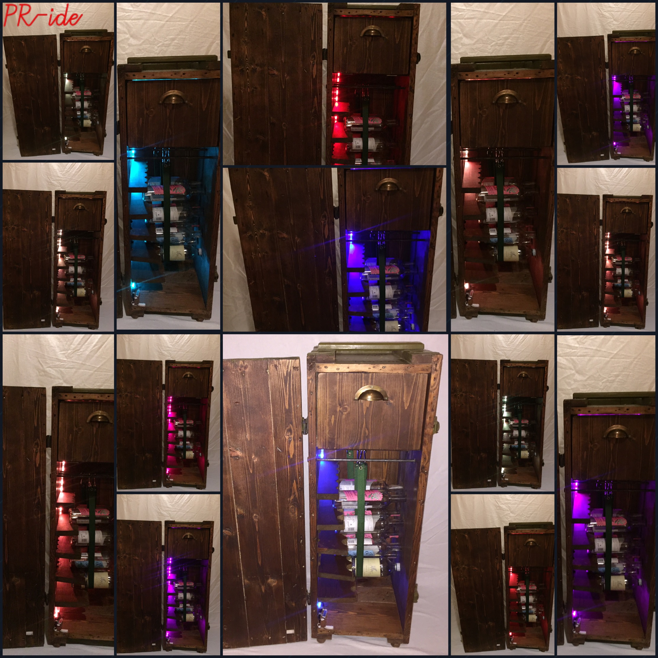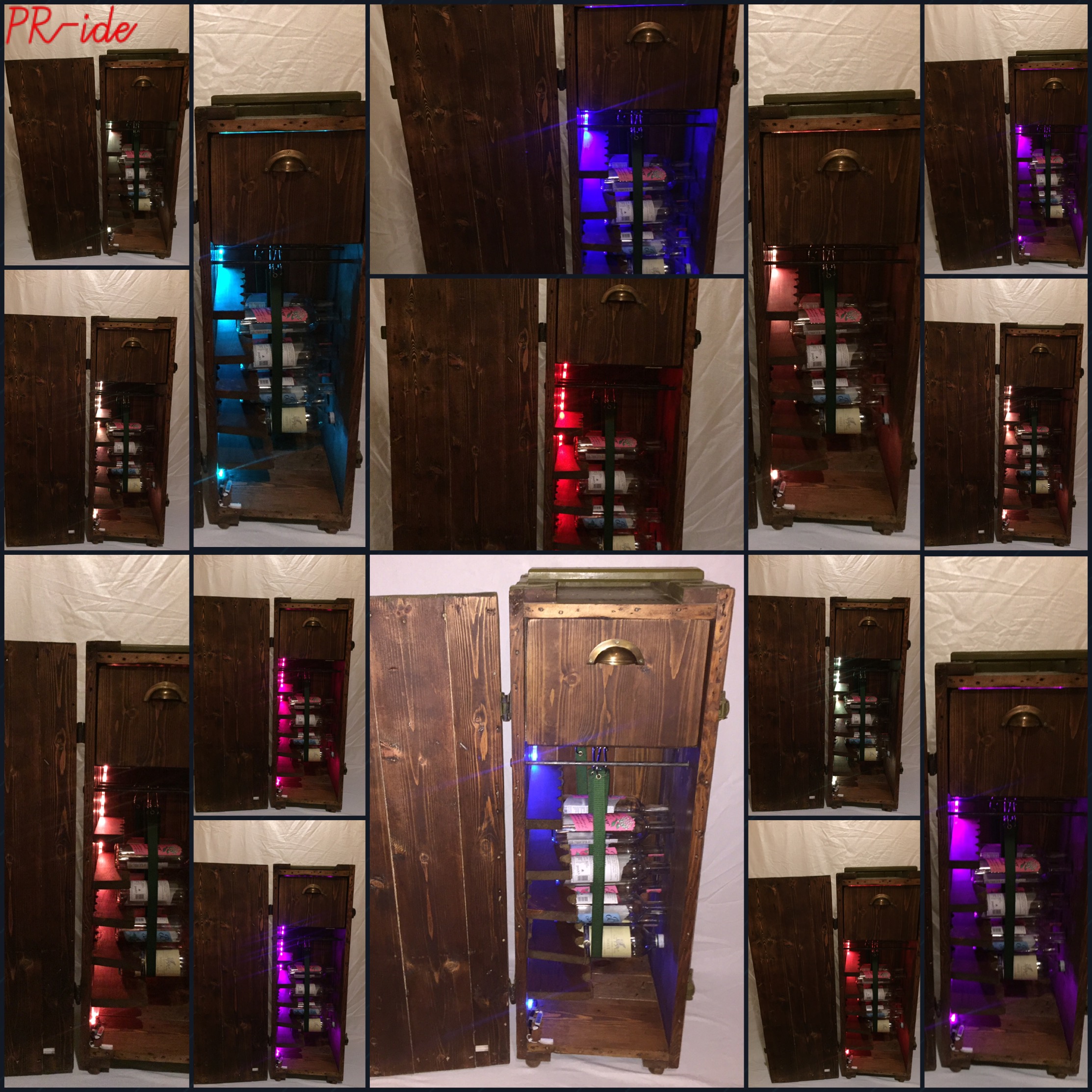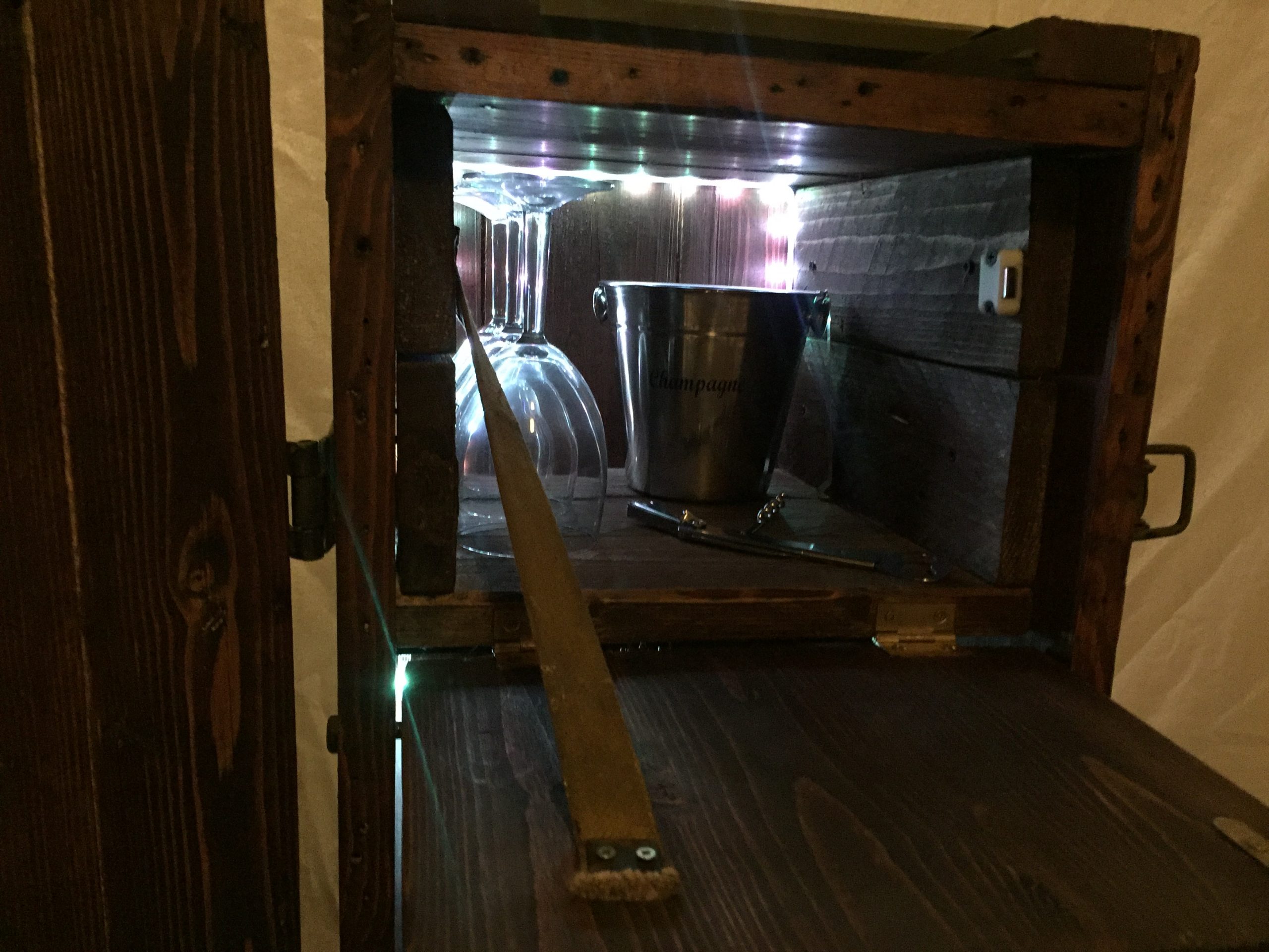 I incorporated LEDs into the design and after some research I was able to source the best quality waterproof LEDs that are connected to a battery pack below the bottom shelf which I have modified a magnetic window switch to. This gives a feature to open the door and the LEDs switch on which helps to save battery life. With a good set of duracells these will last for ages.
