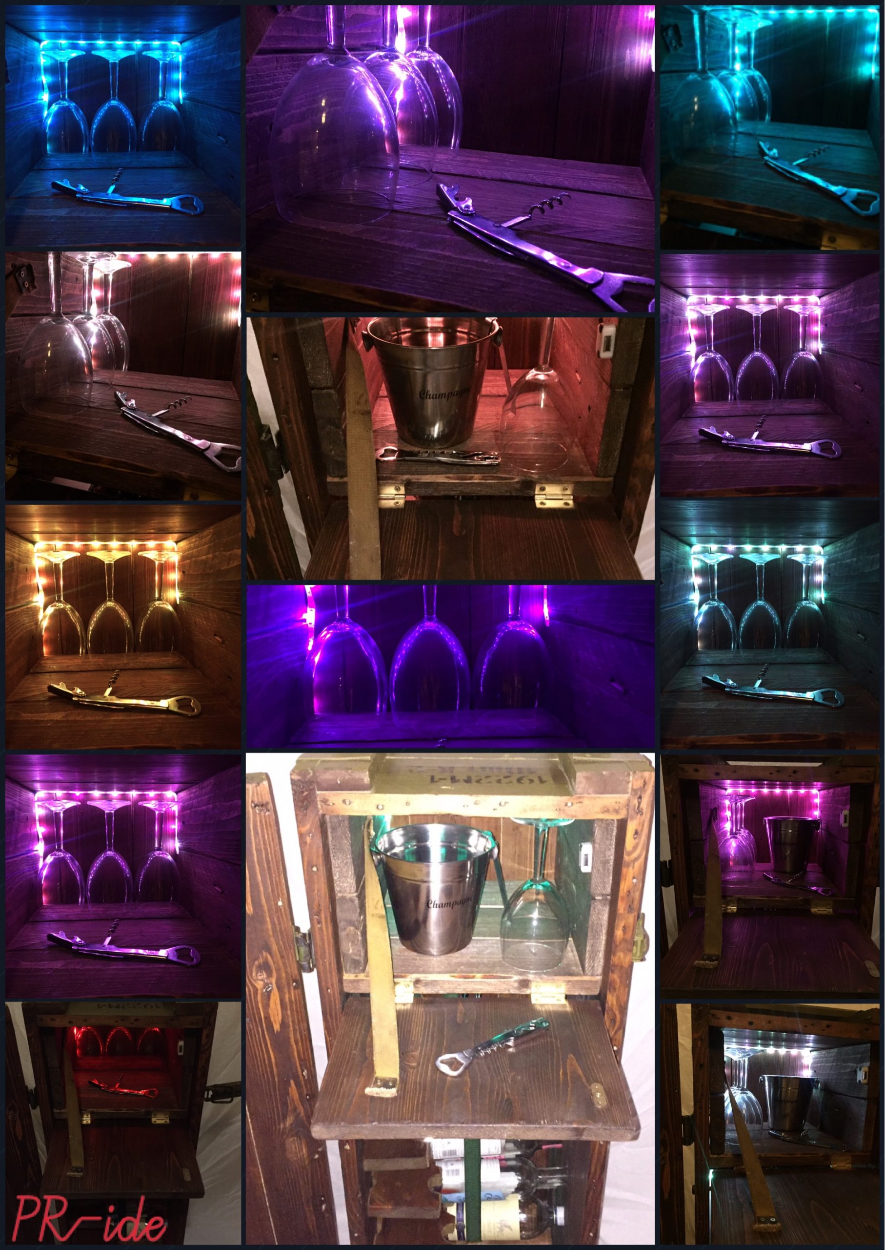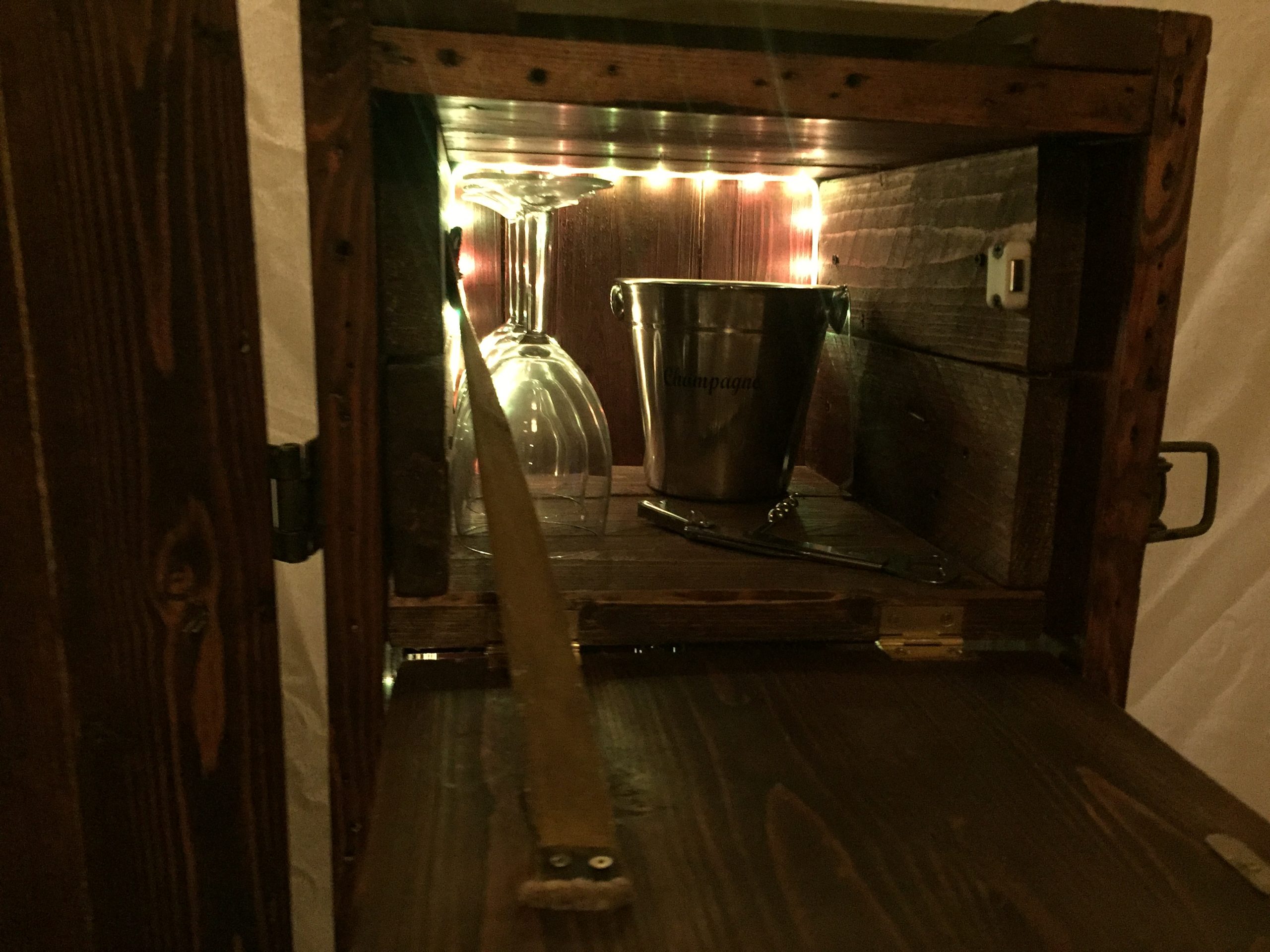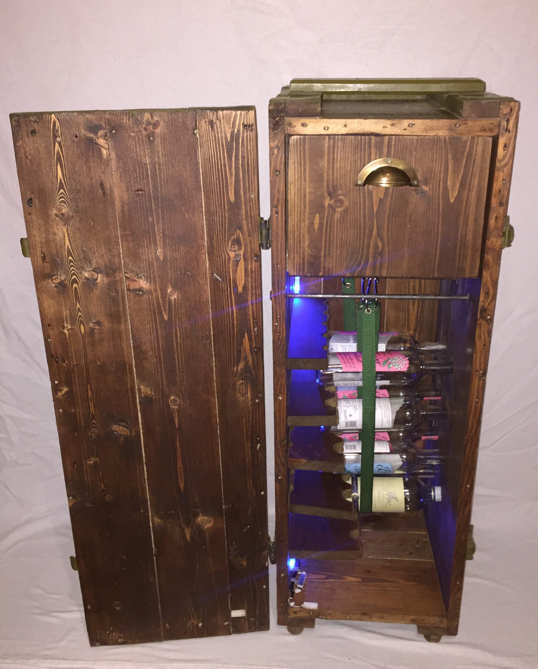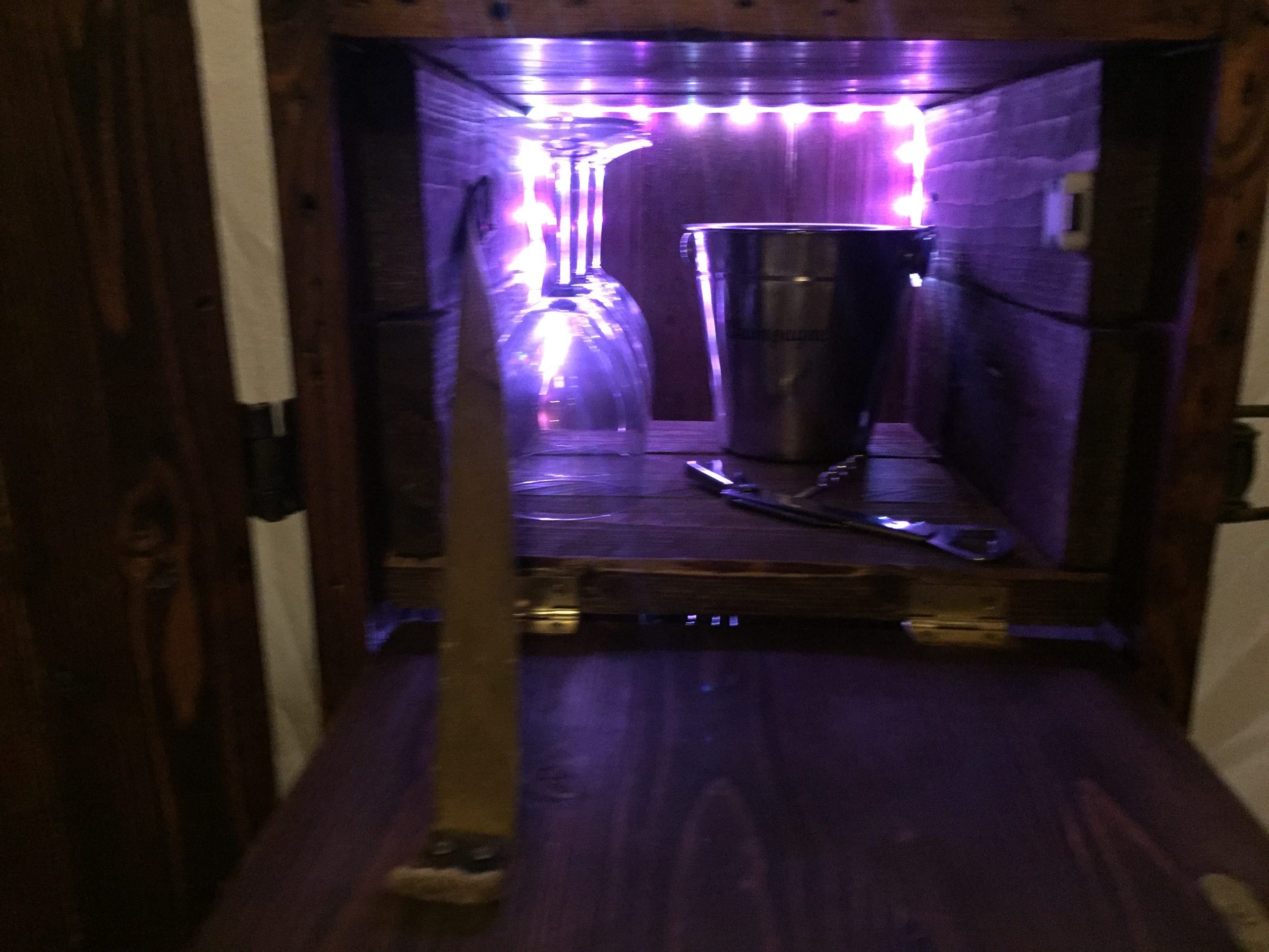 I incorporated LEDs into the design and after some research I was able to source the best quality waterproof LEDs that are connected to a battery pack below the bottom shelf which I have modified a magnetic window switch to. This gives a feature to open the door and the LEDs switch on which helps to save battery life. With a good set of duracells these will last for ages.