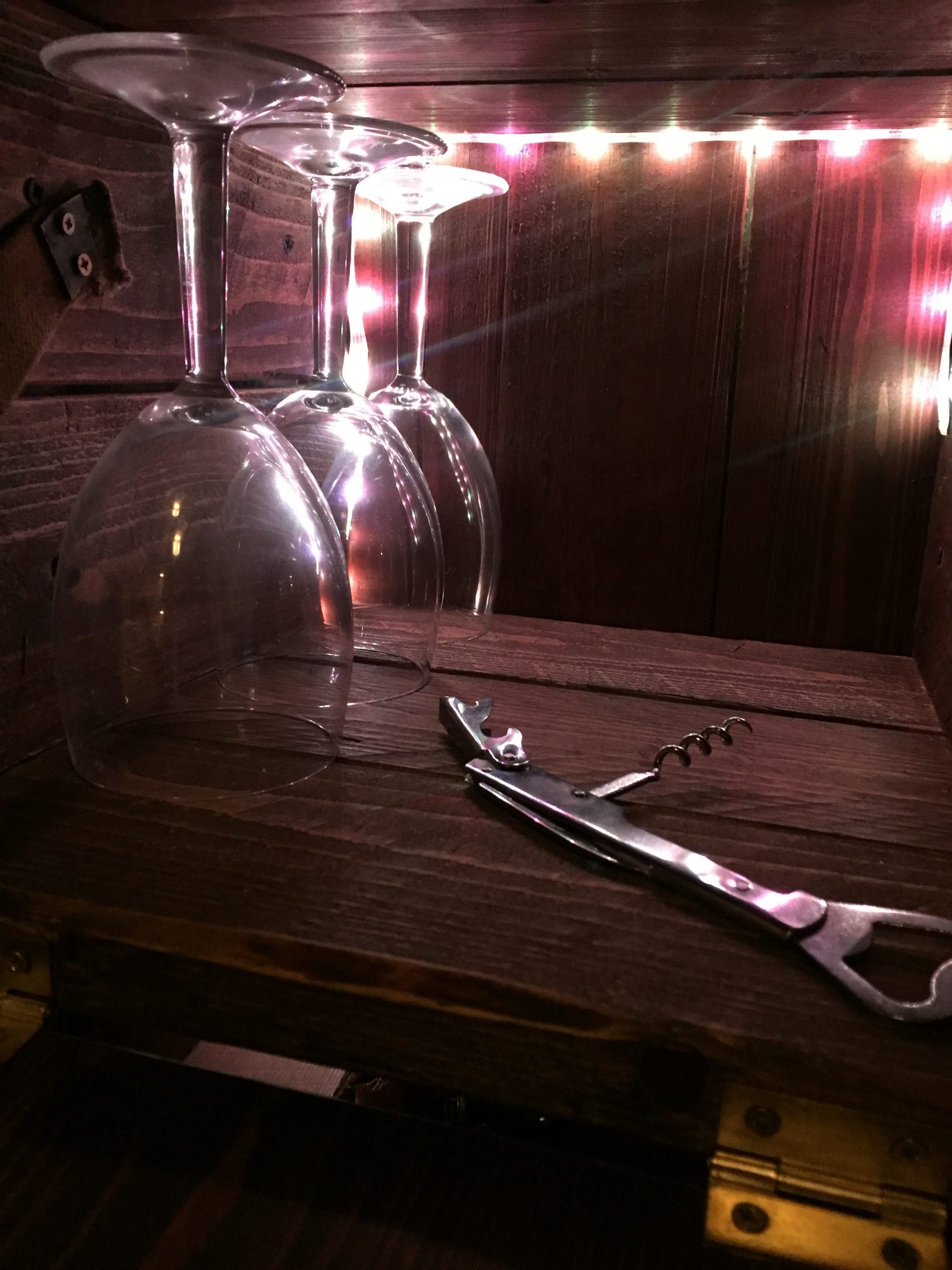 The cubby hole is large enough to comfortably fit 9 regular sized wine glasses or a mixture of glasses/ wine bucket and accessories etc.
